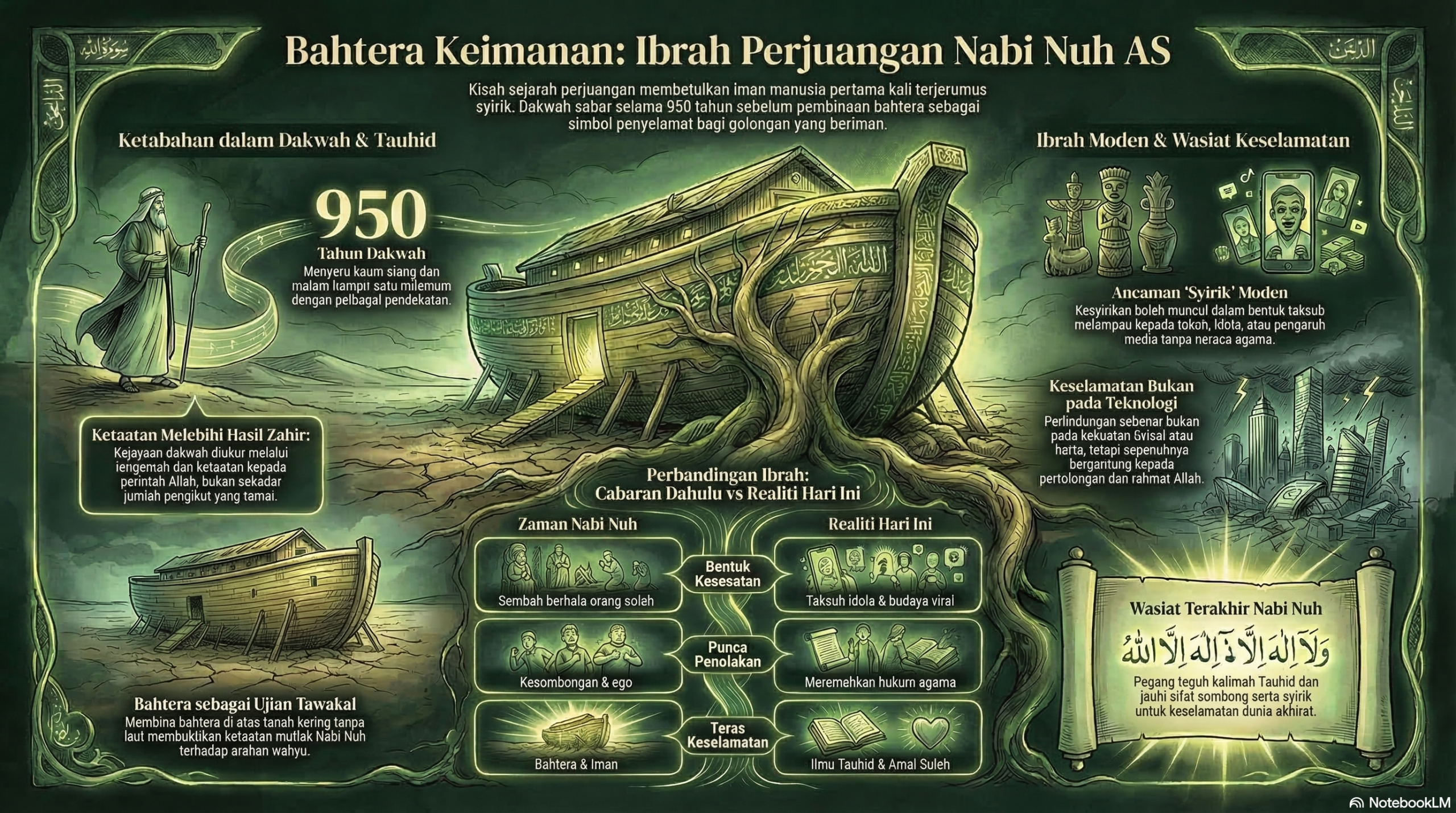 Kisah Nabi Nuh AS mengingatkan kita bahawa keselamatan dan perlindungan sebenar tidak datang daripada kekuatan fizikal, kemahiran manusia, atau harta benda semata-mata, tetapi sepenuhnya bergantung kepada pertolongan Allah SWT.
