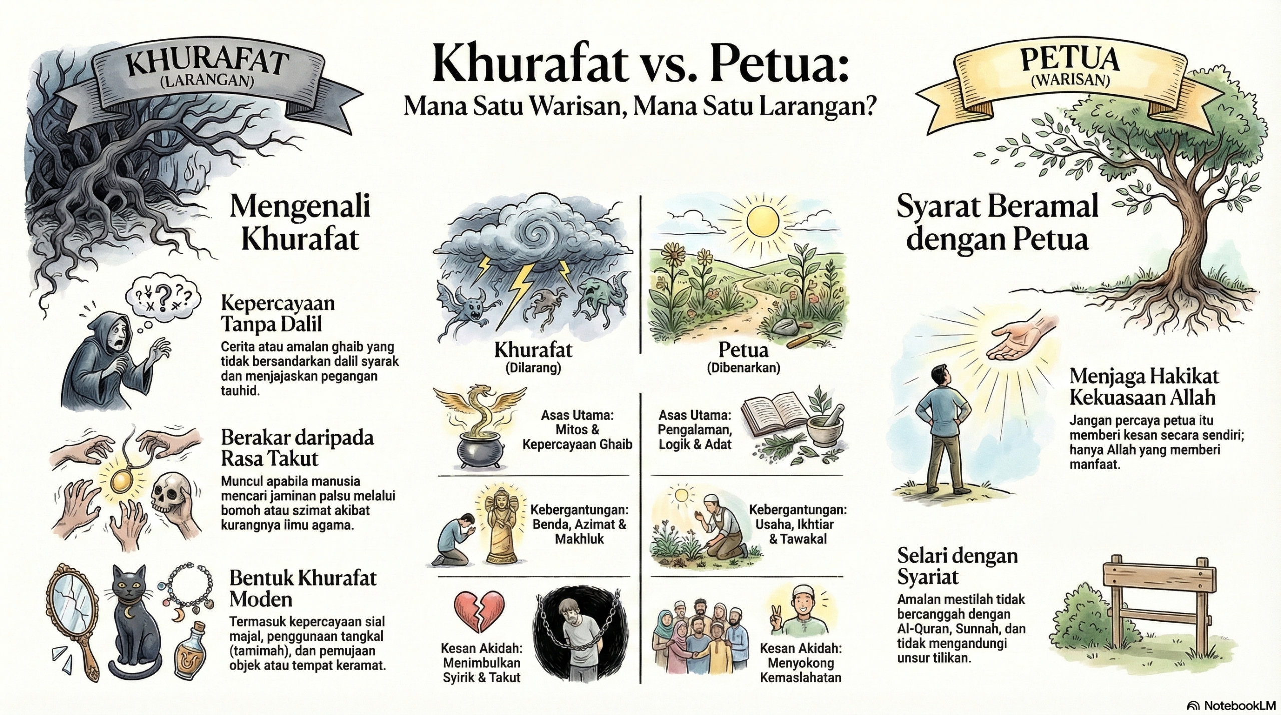 | Asas | Pengalaman, logik atau adat berasas. | Kepercayaan ghaib/mitos tanpa asas syarak. |