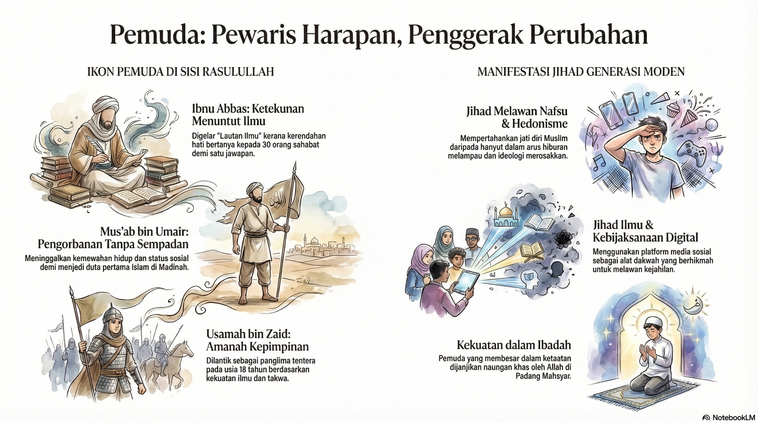 Perjuangan pemuda zaman Nabi SAW bukan hanya dengan pedang, tetapi juga dengan ilmu (seperti Ibnu Abbas RA), penulisan wahyu (Zaid bin Thabit RA), dan diplomasi antarabangsa (Ja’far bin Abi Talib RA).