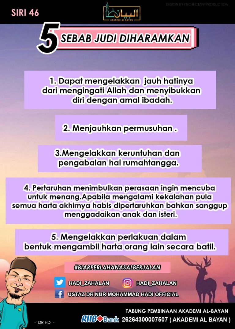 Oleh itu, marilah sama-sama saling mengingati antara satu sama lain bahawa arak dan judi ini adalah perkara yang sia-sia. Malah ia akan mendatangkan kemudaratan dan kesan negatif kepada diri sendiri serta orang sekeliling.